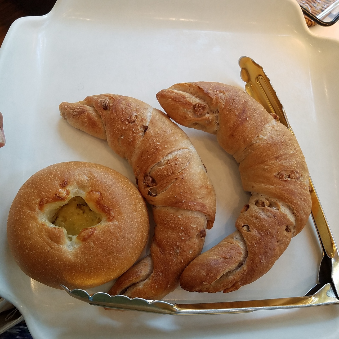 今日は定番のくるみの入った塩パン、紫いもボール、季節のパンで米粉のパンにしました。どのパンも美味しくリーズナブルでオススメです。