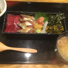ランチにて利用いたしました。博多丼にしましたが、胡麻鯖、明太子、高菜、イカとウニ、マグロがのっております。御飯の量を選べたのですが、味がこいものが多いので大サイズにしておけばと後悔いたしました。カウンター席とテーブル席がありました。