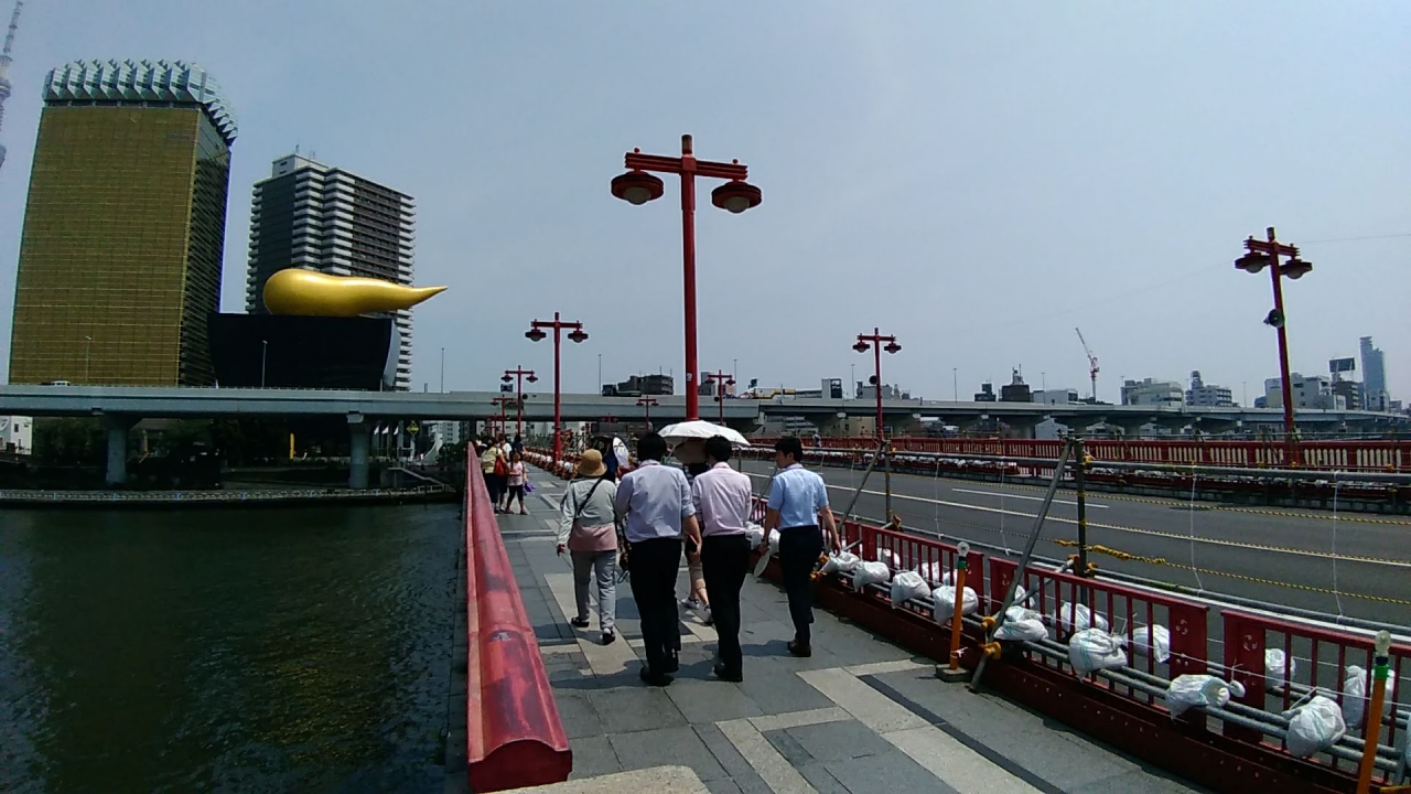 アサヒビールの本社ビルとその横にある金色のオブジェ「聖火台の炎」、東京スカイツリー、隅田川を眺めながら、浅草からこの吾妻橋を徒歩で渡ることをおすすめします。歩きながら刻々変化する素晴らしい景色に感動間違いなしです。