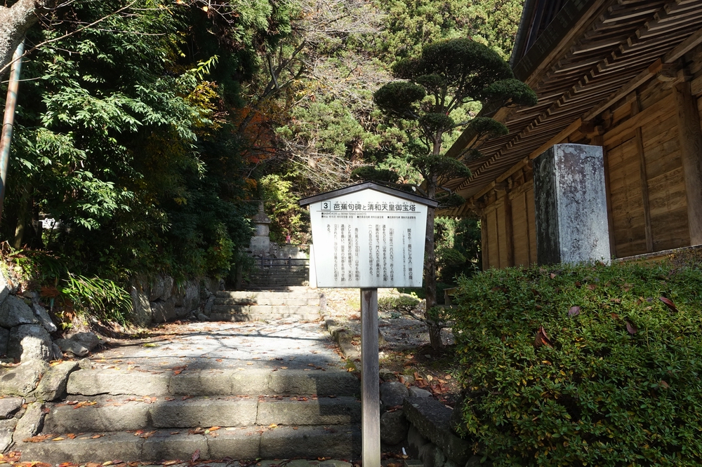 根本中堂の西隣には芭蕉の句碑とその奥に清和天皇御宝塔があります。句碑には「閑さや 巌にしみ入 蝉の聲」と刻まれているようなのですが… 読めません…