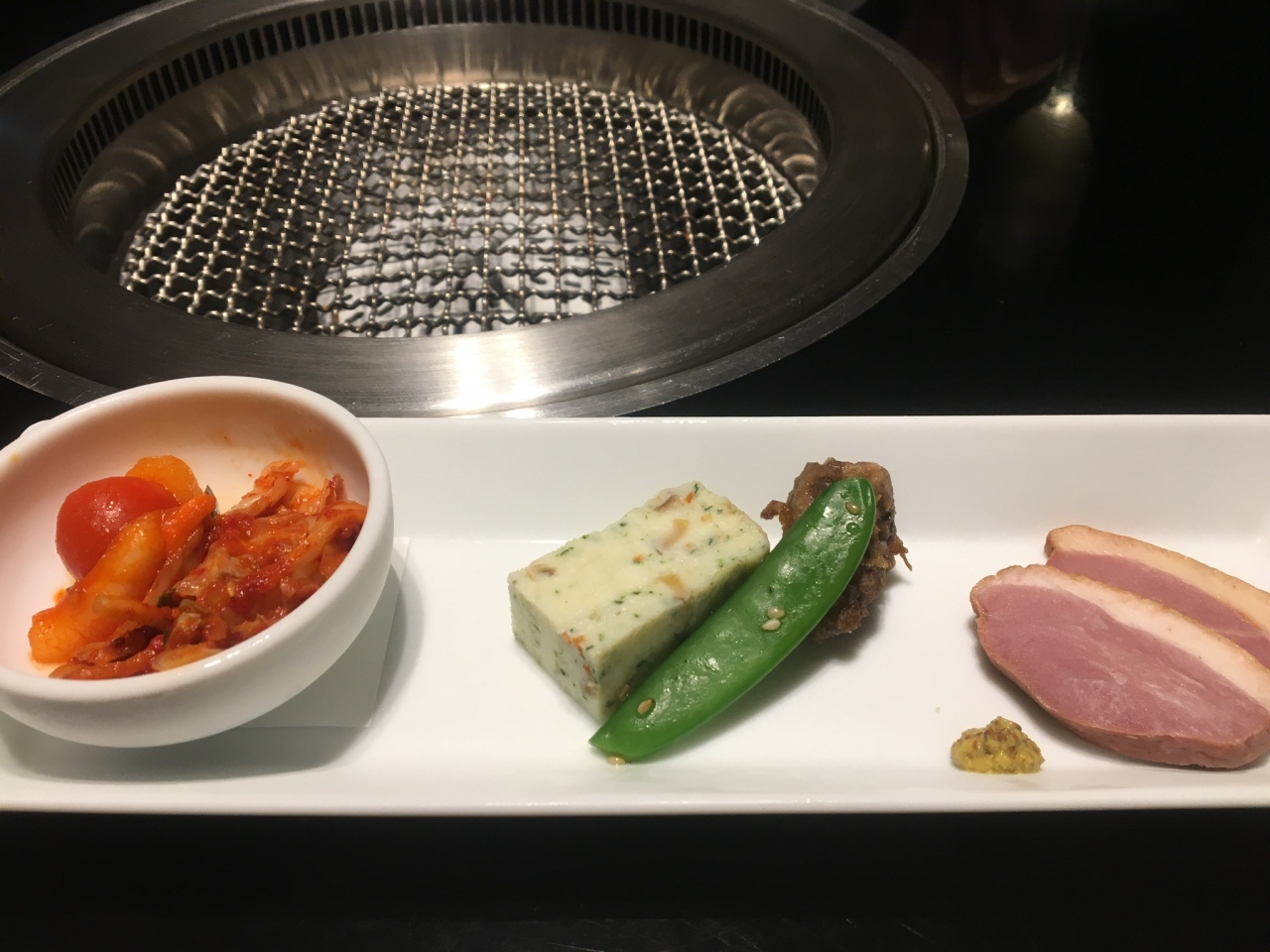 前菜盛り合わせはキムチ、合鴨ロースト、スナップエンドウのナムルなど。前菜もひとつひとつ美味しくいただきました。