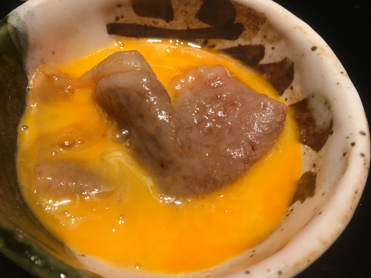 サーロインの焼きしゃぶはお店の方が焼いてくれて、卵につけていただきます。