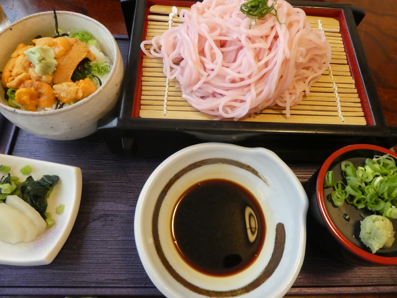 新居浜駅から徒歩10分くらいにある和食屋さん。この時はランチで、蕎麦とうに丼のセットを注文しました。蕎麦には梅肉が練りこまれていて、鮮やかなピンク色をしていました。うに丼は小ぶり。味は、蕎麦のほうはどちらかと言うとソーメンのような感じで、うに丼は甘くて美味しかったです。