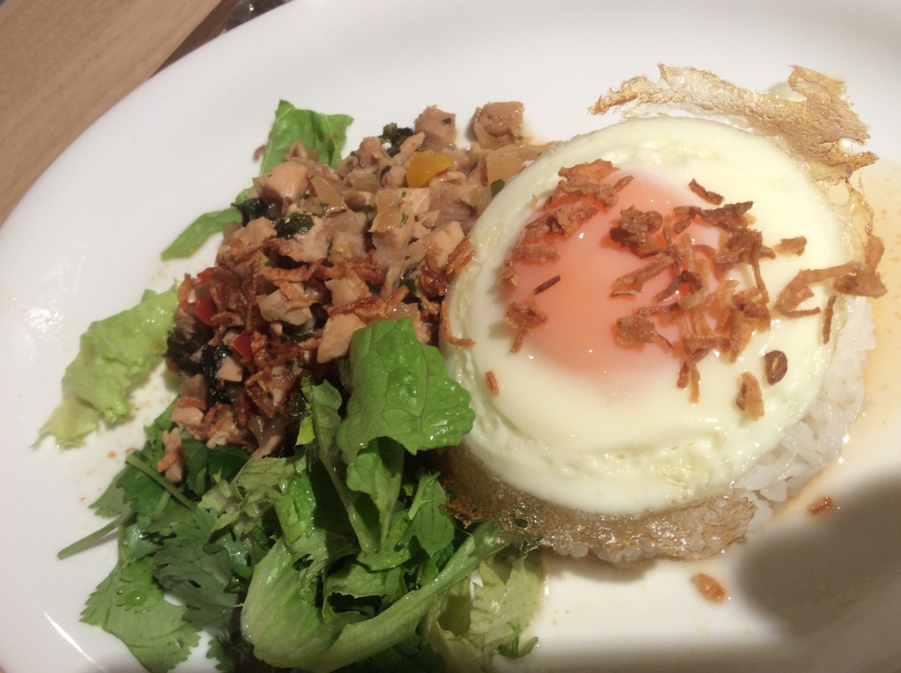 梅田の阪急三番街の中のフードホールにあるお店です。 アジア各国の料理があり、その中からタイ料理のガパオライスを頂きました。 他にチヂミなどの韓国料理もありました。 小さなスープと生春巻きがついて税込み980円。 ガパオライスはピリ辛で美味しかったです。