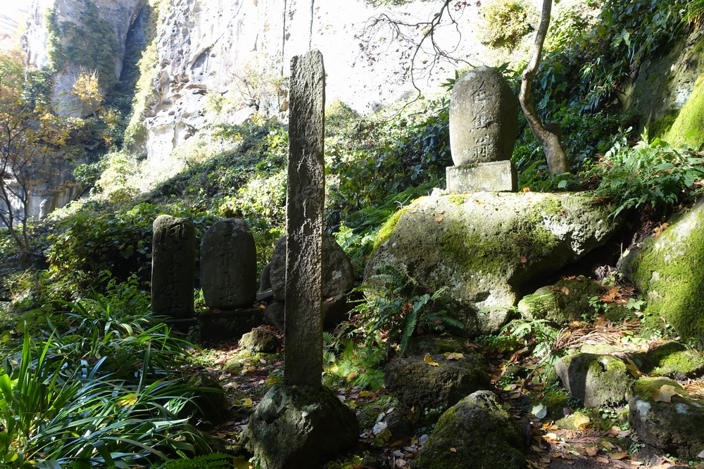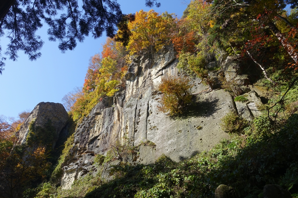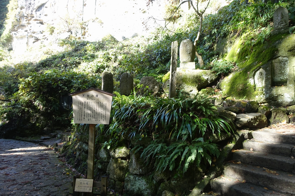 このあたりであの俳句を詠んだのでしょうか。あたり一帯を木に囲まれていて、夏だったら蝉の鳴き声がすごそうです。せみ塚の場所から上を見ると断崖絶壁が見え、「岩にしみ入る」の岩はこんな感じだったのかなと想像させます。