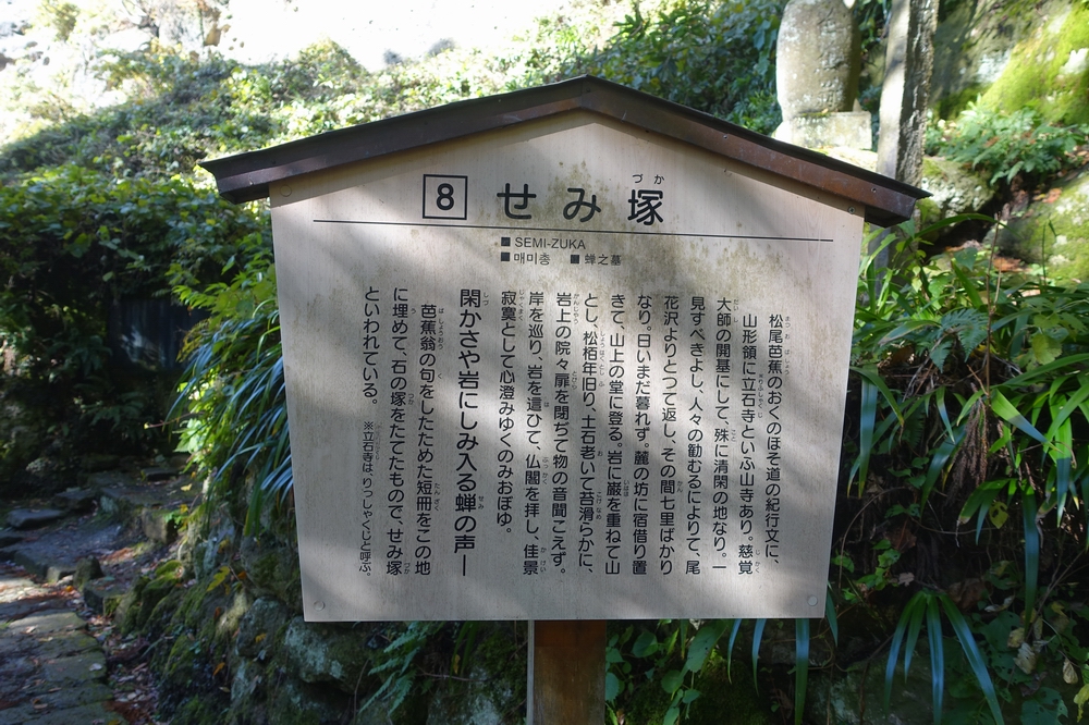 山門から入って仁王門までの石段の途中にあります。松尾芭蕉が詠んだ有名な俳句「閑かさや 岩にしみ入る 蝉の声」の短冊を納めた場所で、記念碑のようになっています。