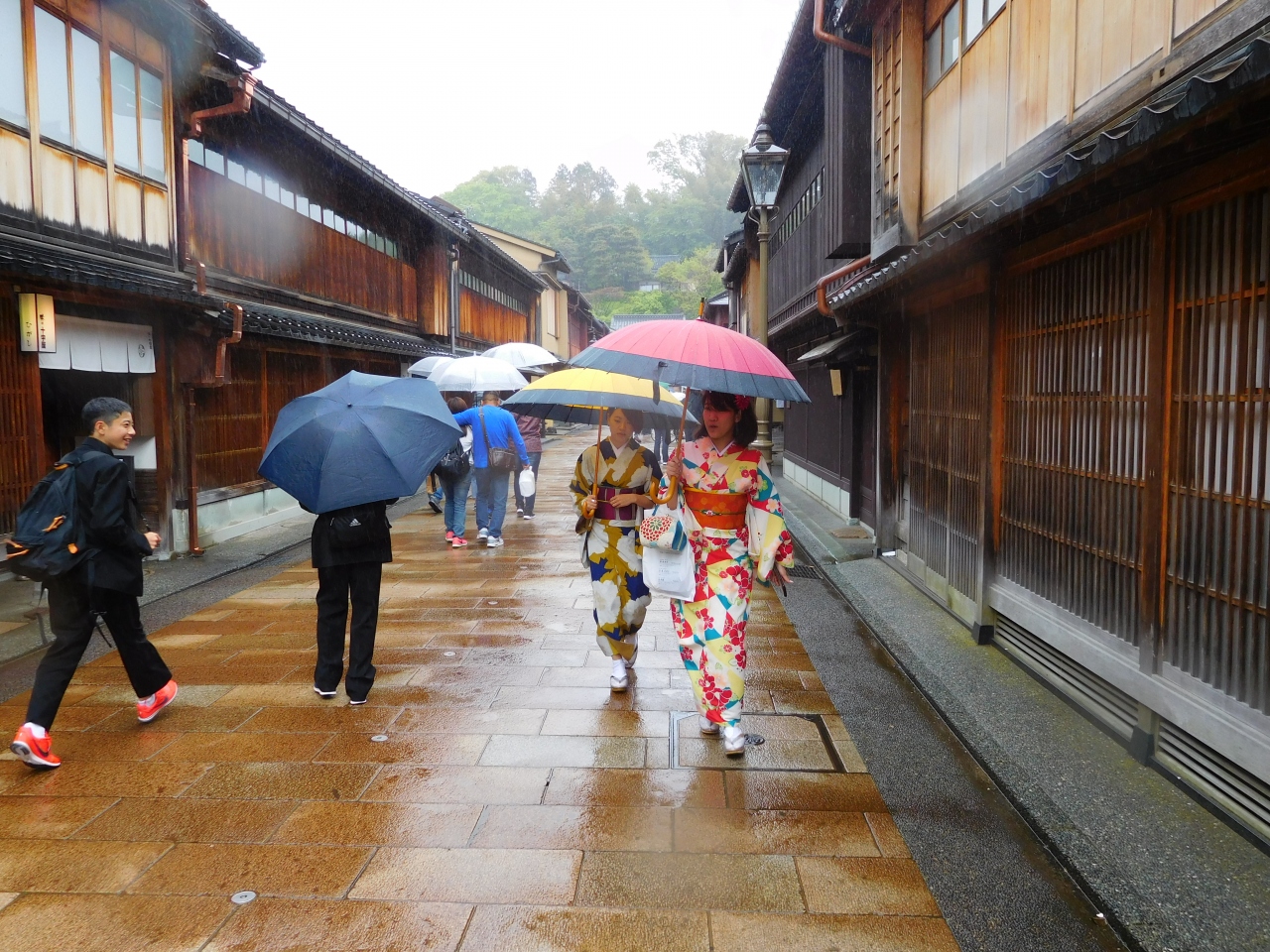 ひがし茶屋街など、金沢の茶屋街は、日本人より外国人に人気の街かも知れません。石畳の道に、出格子の家々が並び、江戸時代の雰囲気があります。カフェやお土産屋さんもなかなかの雰囲気です。観光客だと思いますが、浴衣を着て歩いている女性もいます。