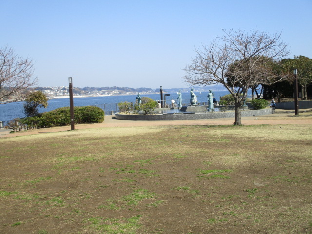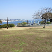 小田急江ノ島線片瀬江ノ島駅から境川にかかる橋を渡って右折し地下道を通り弁天橋を渡って江島神社参道入口の左にある江の島北緑地広場に歩いて12分ぐらいで着きます。江の島北緑地広場は東京オリンピックの際に制作された世界平和女性群像の噴水やモース記念碑など見どころ豊富です。緑が多く花も咲いていて海風に吹かれながらの散策は気持ち良いので江ノ島観光の際は海越しに東浜海水浴場眺めることをお勧めします。
