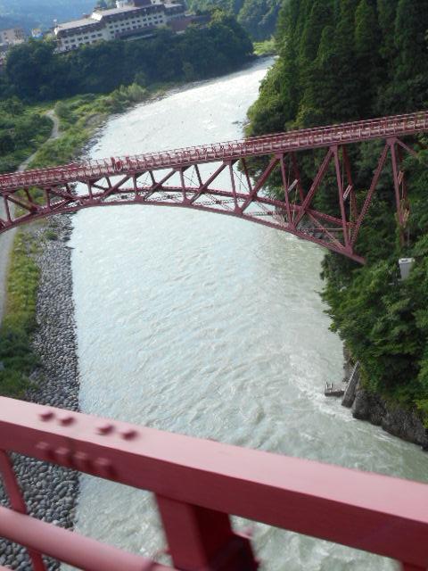黒部峡谷のトロッコ列車に乗りました。その乗り場に近い場所にある橋ですので、宇奈月駅の展望所からもみえますし、トロッコの車窓からも見える景色の一つです。2本赤い橋が並んでかかっていて、アーチがきれい。素敵な撮影スポットです。