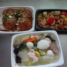 レンコン入り肉団子、鶏とカシューナッツ炒め、八宝菜の3種。八宝菜は塩味であまり濃い味でなく、優しい味。