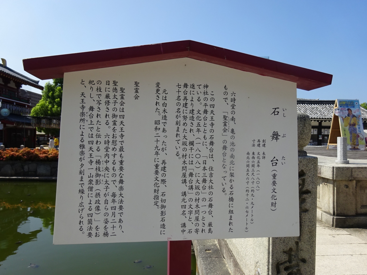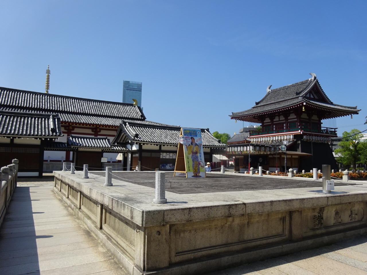 和宗総本山で、今から約1400年以上前に聖徳太子が建立した、日本仏法最初の官寺である四天王寺。この敷地内には、住吉大社の石舞台、厳島神社の平舞台とともに「日本三舞台」とされている、重要文化財です。残念ながら、訪れた時には、イベントのポスターが置かれていて、雰囲気を台無しにしていてがっかりでした。