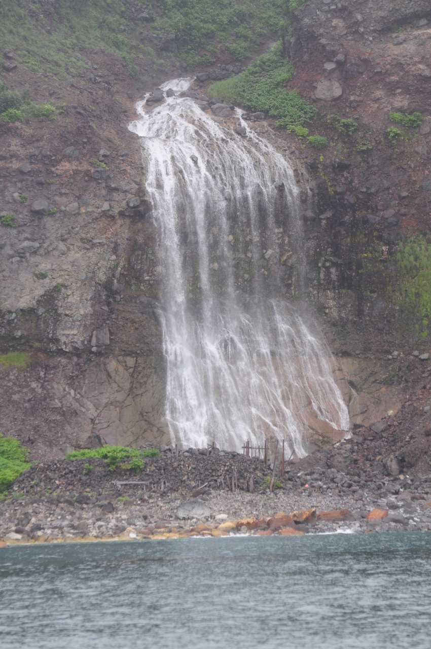 船に乗った後に船酔いや、酔い止めの薬を飲んだ影響が出て車の運転ができなくなると困るので、午後の便を予約し、宇登呂に宿を取った。しかし予約した日は波浪のため欠航となってしまった。一旦諦めかけたが、知床岬クルーズと胸に書いたJTBの添乗員さんと出会って話をしていたら翌朝予約をし直していくべきだと言われて、急遽訪問先を変更して翌朝の予約を入れた。翌朝宇登呂のホテルで目覚めると周囲は濃霧だった。観光船に連絡すると条件付きで出航すると言う。条件付きとは、知床岬の方へ行ってみて、霧が濃いようなら途中から引き返す可能性があるのだという。その場合、行った距離に応じて返金すると言う。出航の30分前から乗船が始まるので9時半少し前にウトロ港トンネル手前のチケット売り場に行った。チケット売り場周辺には駐車場がないが、みな道路脇等に停めて切符を買っていた。大人6500円だが、割引クーポンを印刷して持って行ったので、5850円になった。トンネルを超えると有料駐車場なので400円を払って入った。駐車場に一旦入ると出られないので、弁当飲み物を買いたい人は入る前に買っておく必要がある。乗船すると、二階前の600円特別席がすぐ満席になる。特別でなくても座れないわけではないので、やめて置いた。行きに半島側となる右側から席が埋まっていく。最初二階後ろの左側の席を取ったが、一階前方の席を見ると右側がまだ空いていたので、そちらに移った。これで往路で陸地が見えるが、出航してしばらく行くとこの一階席は崖の上の方がみえないことに気付いた。でももう動けないので、時々甲板側面に出て景色を眺めた。ここはふきっさらしなので、7月末で長袖を二枚きていても寒かった。1時間ほど航行してくると波が高くなった。1m程度のうねりがありそうで、船首はそれ以上のダイブして水しぶきを派手に飛ばした。かなりの揺れで気分が悪くなって戻している人もいたが、私たちは出航前に酔い止めの薬を飲んだのが効いたのか酔わなかった。ピッチングが激しいので、通路を移動すると体重が重くなったり軽くなったりした。帰りは波に乗る形になり揺れが収まった。動物が出ると「左舷前方にイルカです!」と教えてくれる。イルカは三度出たが、良く分からなかった。ヒグマは出なかった。降りるときに壁に貼ってあるカレンダーを見ると、7-8割はヒグマが出ているようだった。運が悪かった。