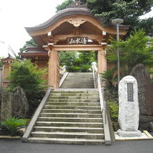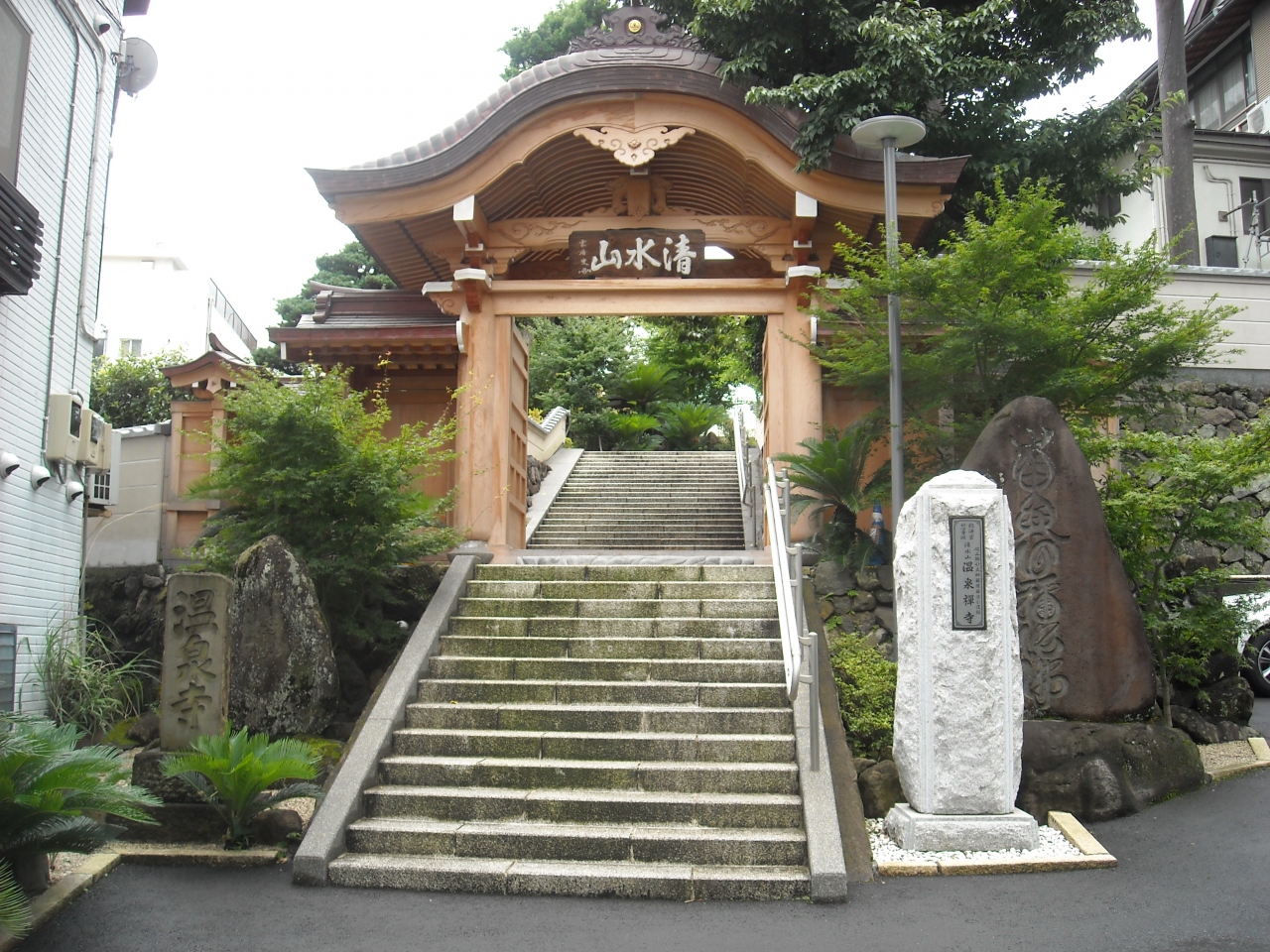 『温泉禅寺』・山門には『清水山』の変額を掲げ。実は大湯間歇泉を探し道に迷っていました、このお寺をつっきり階段を下り振り返ると強烈な寺名が目に入りパチリ、隣にも大きな寺があることから熱海の寺町、昔は町外れの埋葬場だったのでしょう?