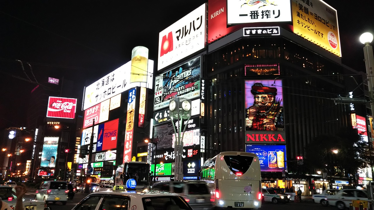 金曜日の夜、初めてすすきのを散策しました。かなり人出が多く、飲食店を中心ににぎわっていました。すすきのの交差点のネオンの大きな看板が色鮮やかですすきのの勢いを感じました。次回はもう少し夜のすすきのを探検したいと思いました。