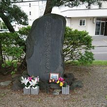 函館市総合福祉センターに隣接する若松緑地の「土方歳三最期の地」から徒歩で25分ぐらいかかりました。函館税務署前の道路の中央分離帯の狭いスペースに石碑がありました。ちょっとわかりずらい場所でしたが、きれいにされていて花が手向けられていました。