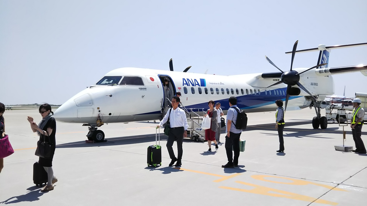 新千歳空港からプロペラ機で着きました。歩いて空港ビルに移動しました。レンタカー窓口は混雑してました。空港ビルは小ぶりですが、羽田や成田の路線があり、二階のお土産の売店はいろいろありました。一階の喫茶もよかったです。