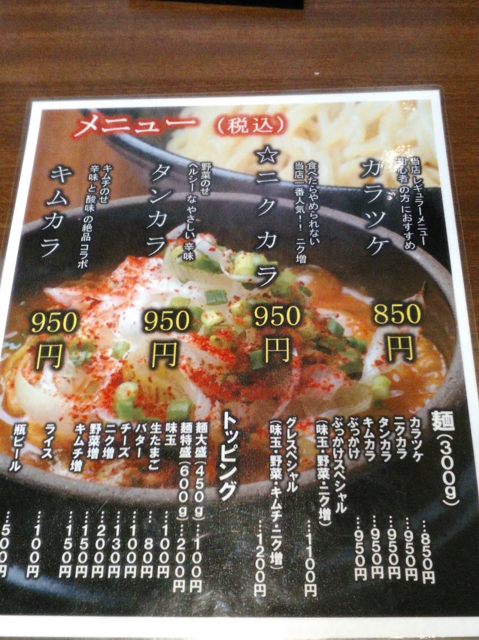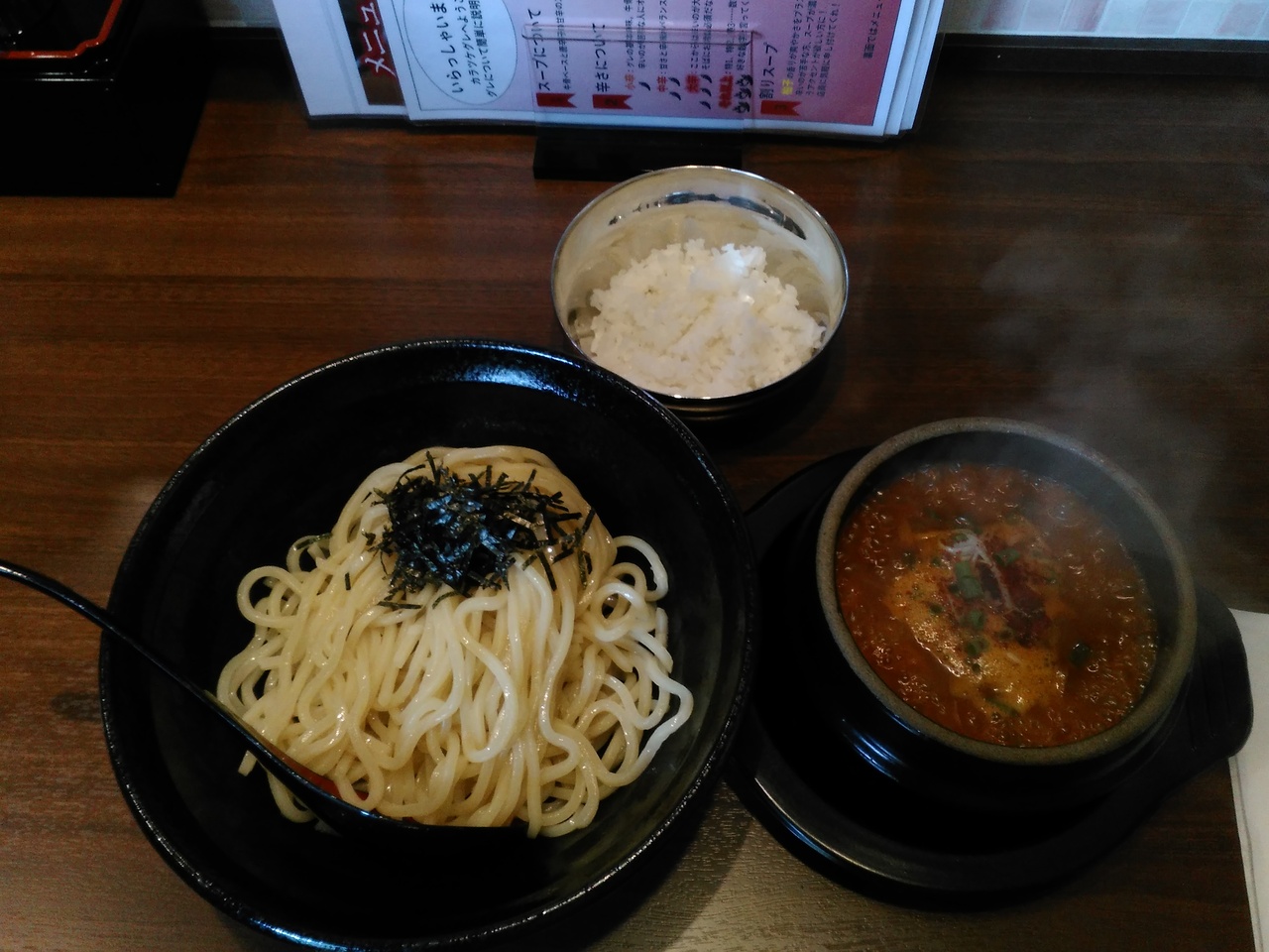 仙台市役所の裏の通りを西に行った所にあります。一番人気はニクカラ950円のようです。今回は、普通のカラツケ850円にしました。辛さは中辛を選びました。スープは甘辛で韓国料理のようで、麺はうどんの細い感じでした。スープは、土鍋で煮ているので、最後まで熱々でした。