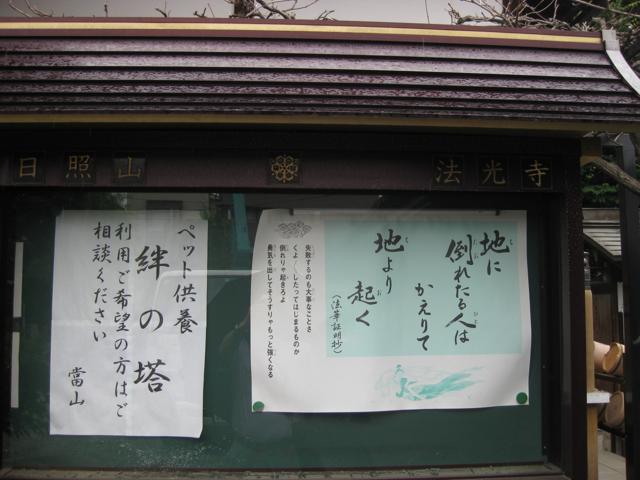 諏訪台通りの中間から下る富士見坂の下に位置する法華宗陣門流寺院。慶安3年(1650年)赤坂に開基、その後移転して明治時代に当地へ移転したそうです。付近には花見寺や雪見寺と呼ばれる寺があり当寺も富士見坂法光寺と呼ばれるそうです。山門、本堂とありますが境内は広くなく見るべきものはありません。