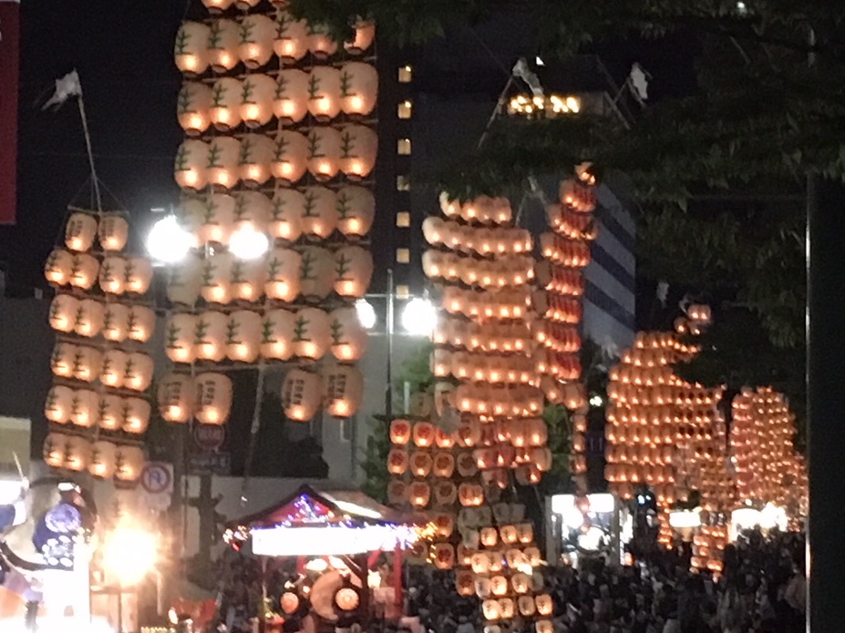 立ち上げた竿燈に、竿を継ぎ足し継ぎ足し、みるみる高さは増して行きます。