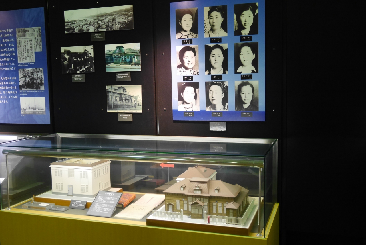 南北樺太の国境線の記録としての境界碑が展示され、各地の境界碑の写真が展示されています。終戦時、ロシア軍の侵攻でなくなられた9人の乙女の写真も掲示され、悲しい歴史を感じます。