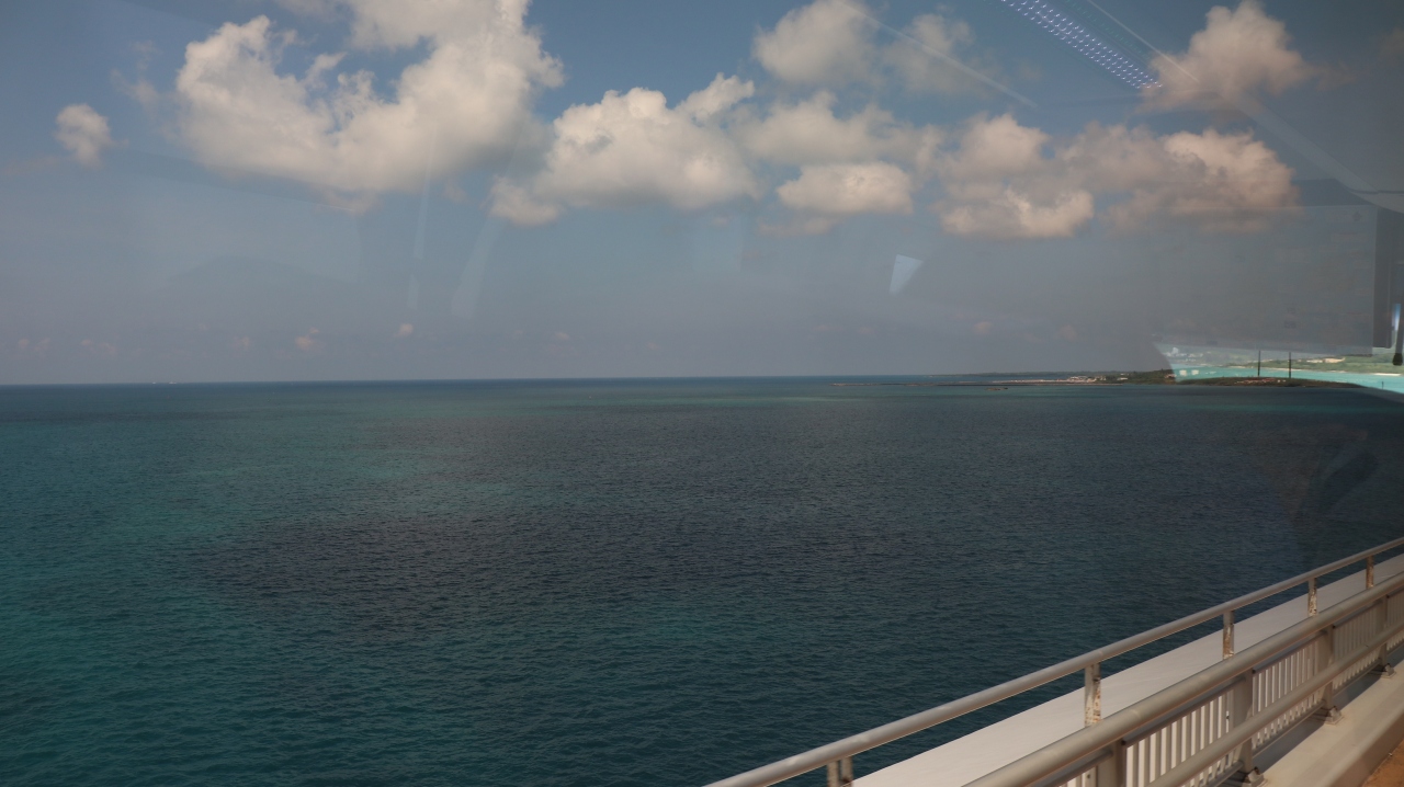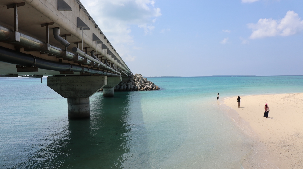 HISのバスツアーで行きました。車でしか行けません。3・5キロの長い橋ですが、歩いて渡っている人を何人も見かけました。渡り切ったすぐの所に駐車場があり、ここから階段でビーチに降りられます。駐車場の近くに「まもる君」と自販機があります。壮観でした。