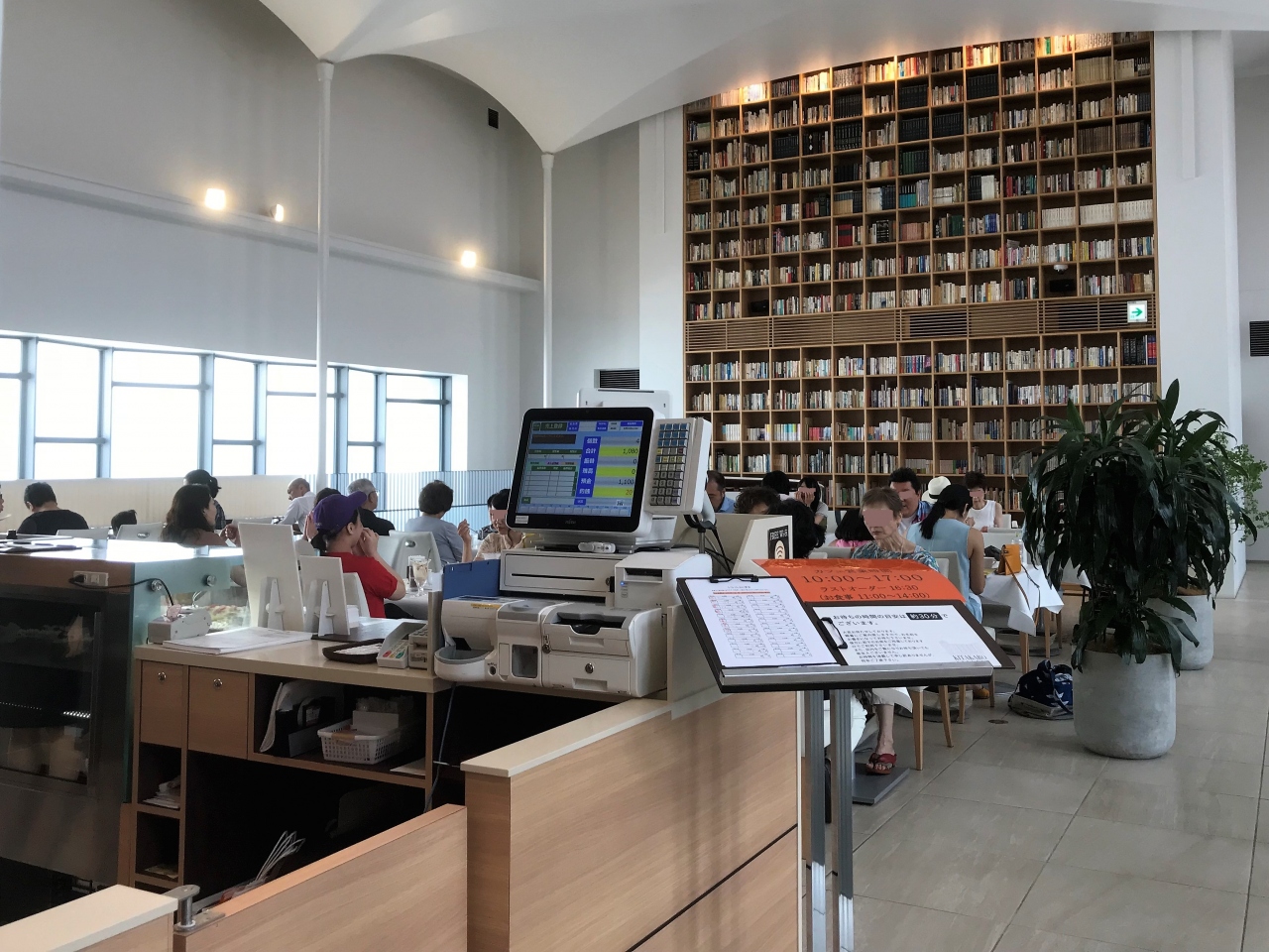 かつて図書館であったことから、カフェの両壁面に天井まで届く本棚!!約6,000冊の本が並んでいて、自由に読んでいいそうですが、高いところのはどうするんでしょうね~などと雑談をしながら待ちました。
