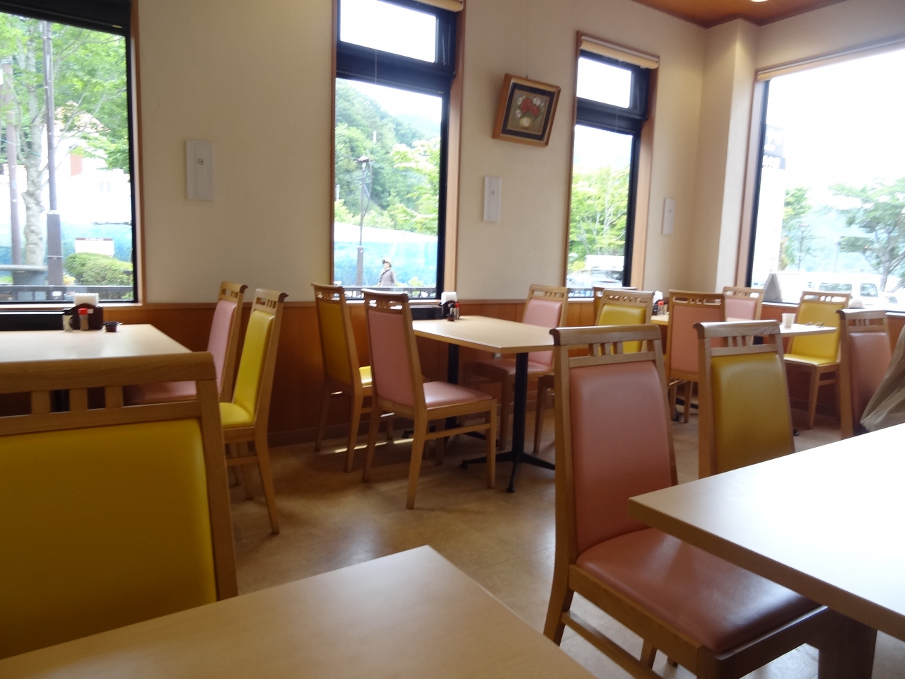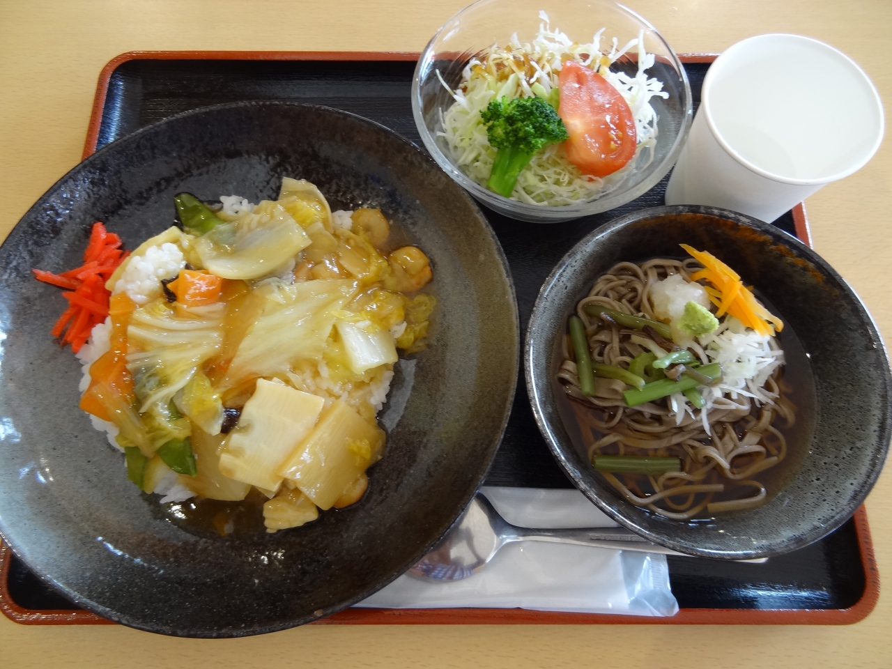 ちょうどランチ時になったので、この道の駅でランチを食べにレストランの中へ。どんなメニューか知らないままテーブル席へ。店内はそれほど混んでいなくて、河口湖がよく見えていました。出されたメニューが私好みの料理。中華飯に山菜そば、ミニ野菜サラダのセット。中華飯は野菜がたっぷりでトロミがあってとても味がいいです。山菜そばはスープの味加減がちょうどよく、そばの食感もよかったです。満足できるメニューが出るとはとてもラッキーでした。