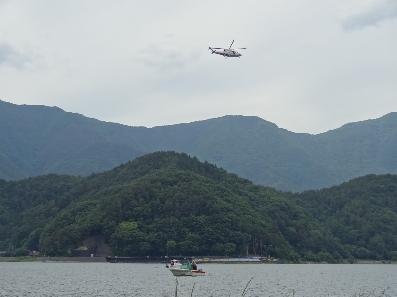 富士五湖で4番目の湖、河口湖に来ました。道の駅があったので、トイレ休憩後に道の駅のレストランでランチ。食後に湖畔の広場でゆっくりしようと思っていたら、警察のボートやヘリコプターが騒音を立てながら行き交っていました。景色を楽しむどころじゃなくなりました。すかさず手持ちのカメラで撮影。どうやら溺れた人がいたようでした。無事ならいいのですが。