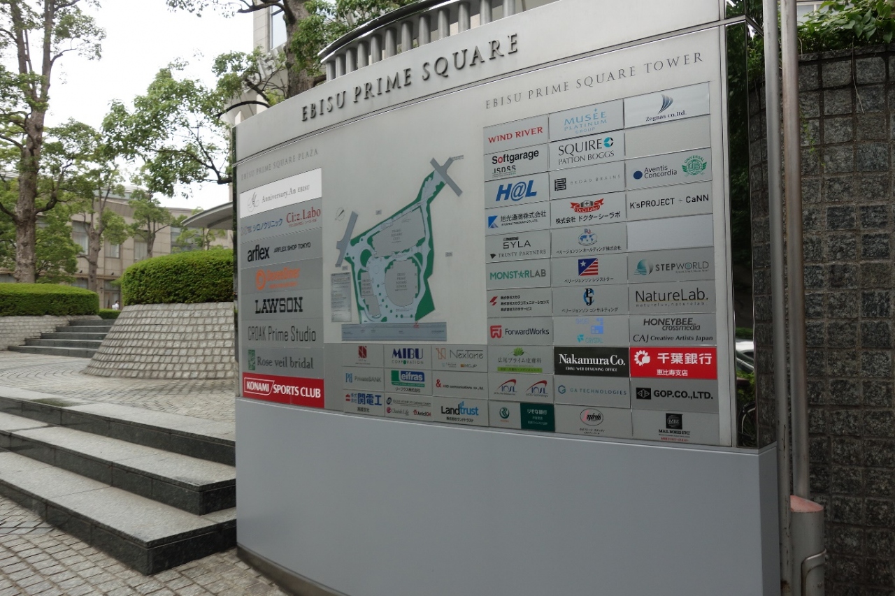 恵比寿駅から駒澤通りを広尾方向へ進むと右手に背の高いビルが見えてきます。緩やかな坂の途中にここプライムスクエアが有りタワー棟とプラザ棟がに分かれます。オフィスのほかに各種物販店やレストラン、スポーツジムなど入った複合施設です。