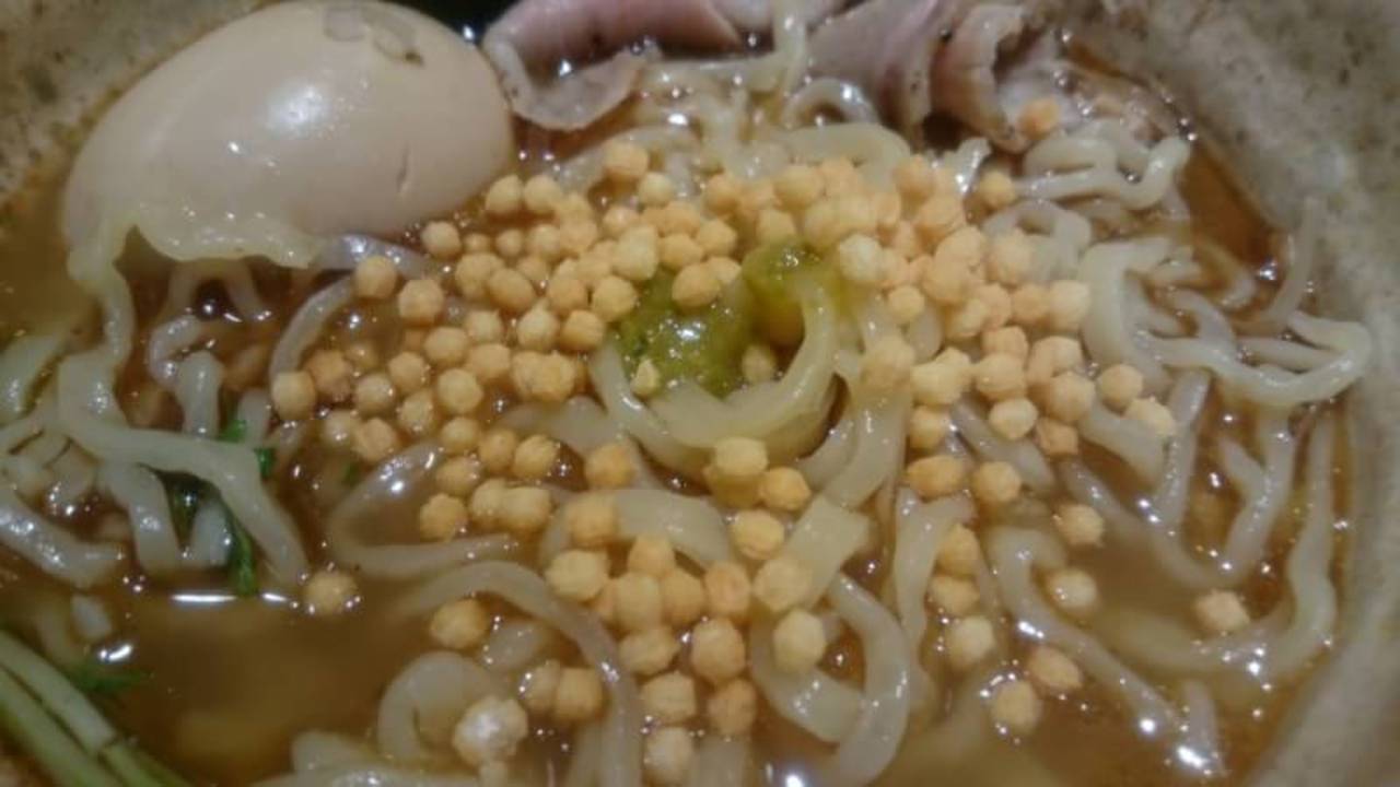 後半はゆず胡椒、あられを入れて味を変えてみました。さっぱりとして引き締まった味わいに変わりました。味玉はとろぷるです!!