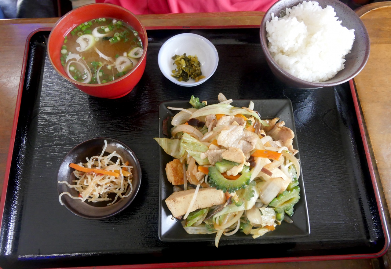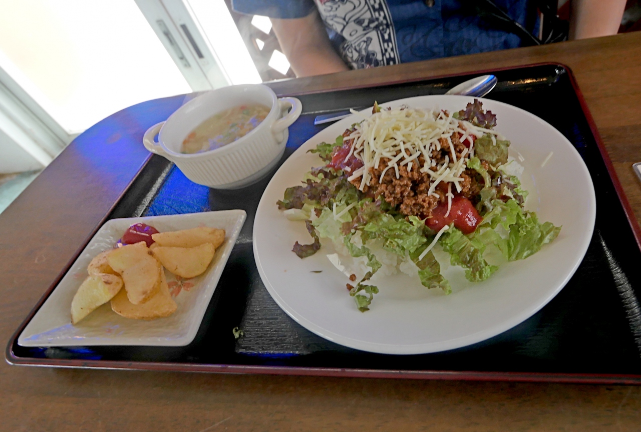 食堂満八によって腹ごしらえ.私はそば&ジューシーセット900円 八重山そばは黄色い麺で塩味だがおいしかった.400に昼食時は一度閉店する.1800‐2200にまた営業 タコライス950円 野菜チャンプルー定食950円 これはボリュームがある.周りに食堂が無いのでここで食べるしかないが,いいとおもう.迎えに駐車スペース 10000円札では支払できない.1000円札を用意する事