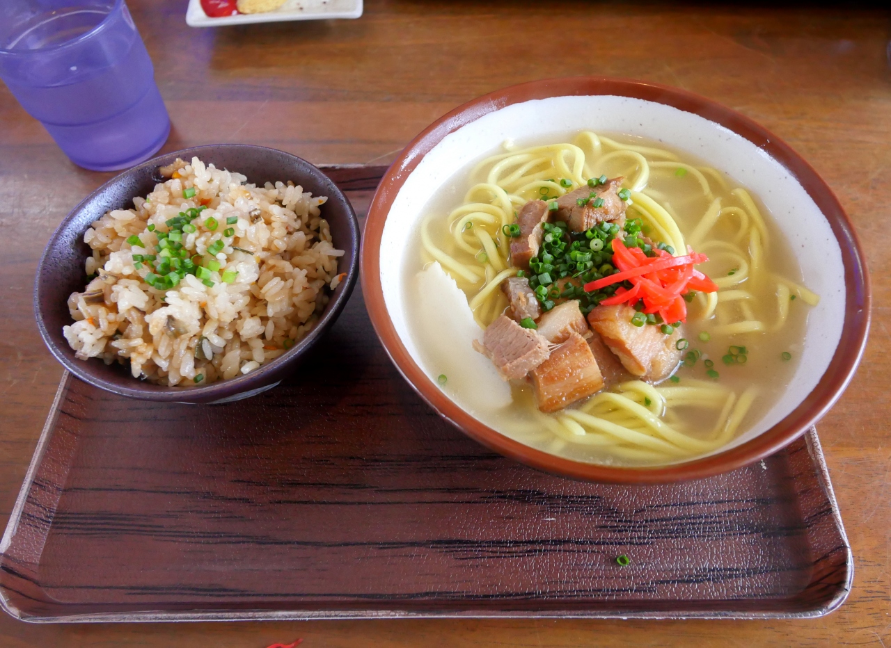 そば&ジューシーセット900円 八重山そばは黄色い麺で塩味だがおいしかった.