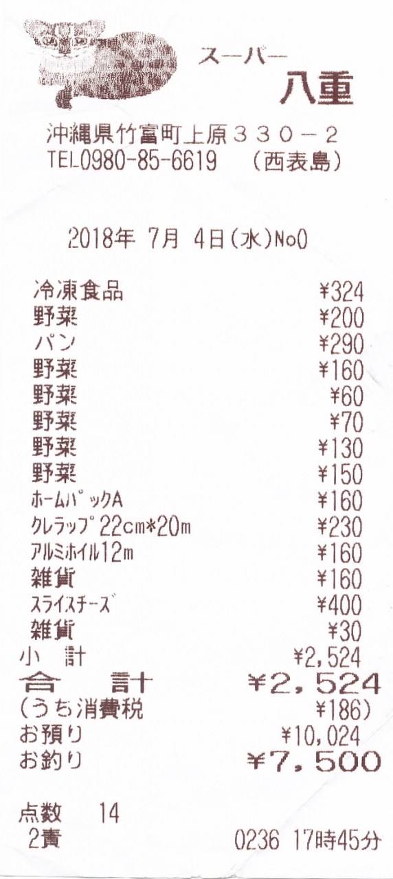 上原地域のスーパーはこことスーパー八重 一般的にはここの方が品物の数が多い ワインなど酒類も豊富だ.しかし卵は台風のためここにはなかったが,八重にはあった.都会のスーパーとは異なり,コンビニに毛が生えた程度だが,二つ合わせると何とか必要な食品は手に入る.石垣島より若干割高な程度だ