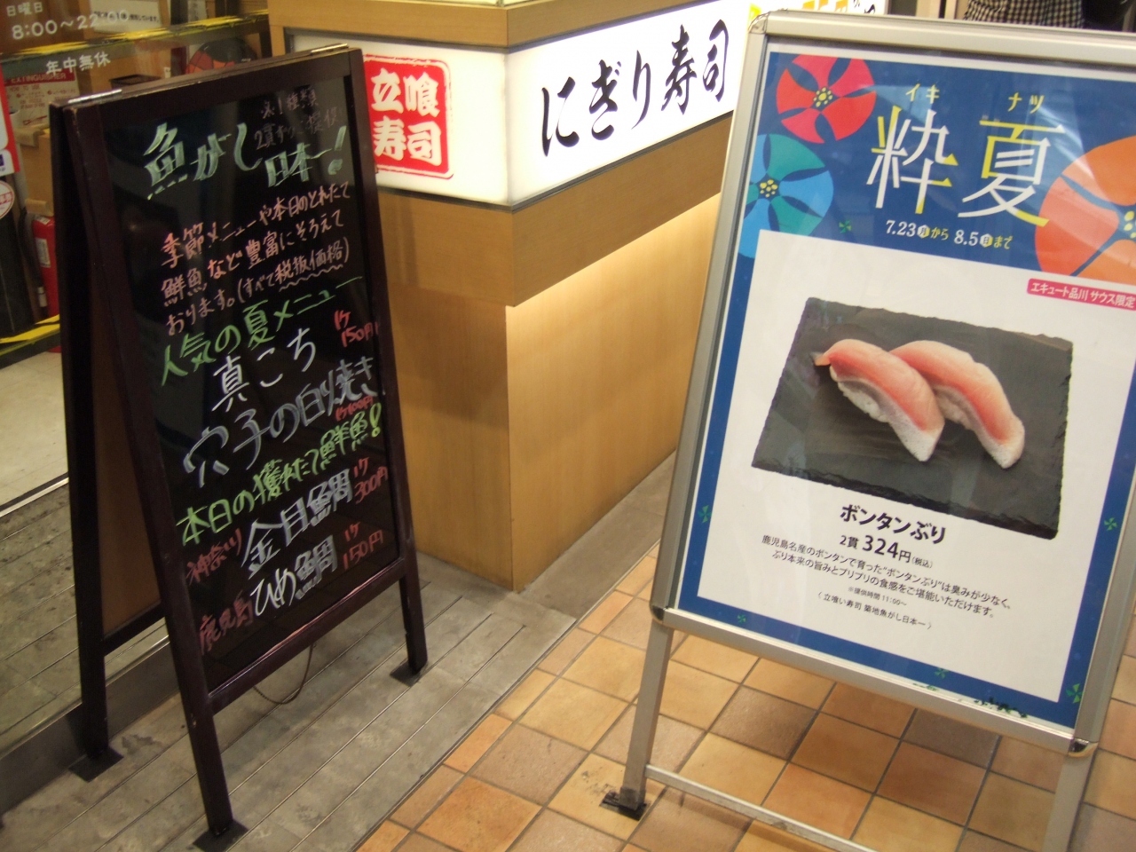 久しぶりにこちらの寿司が食べたくなり、新横浜から新幹線で品川に出て、京急へ乗り換える間に立ち寄りました。夏の日曜なので若干ネタの種類は少な目でしたが、スズキやコチなど、なかなかお目にかかれないネタが安く、そして美味しく食べられました。