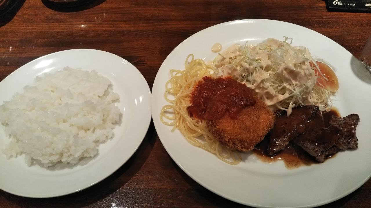 大阪梅田近くの高架下にある新梅田食道街にあるレストランです。お昼はお得なランチメニューがあります。先にスープから始まり、ステーキとクリームコロッケでおいしかったですね。このメニューで900円はリーズナブルです。