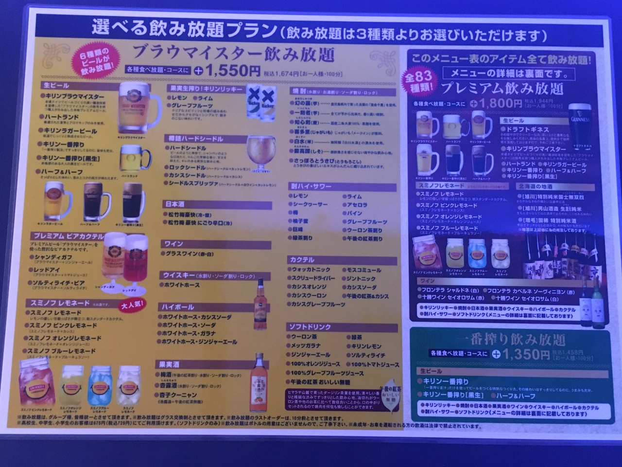 今回は二大ジンギスカンと道産山わさびの三枚肉食べ放題とブラウマイスター飲み放題にしました。同僚の1人は飛行機で10% OFFクーポンをもらったようなので、それを使いました。