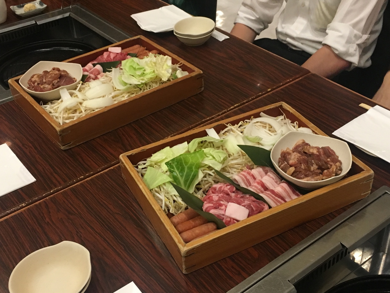 食べ物に生ラム、ジンギスカン、豚肉、ソーセージと野菜が付いています。ラム用のタレとジンギスカンのタレが別々で、ジンギスカンのタレに山わさびを入れるそうです。それでタレが若干スパイシーになります。