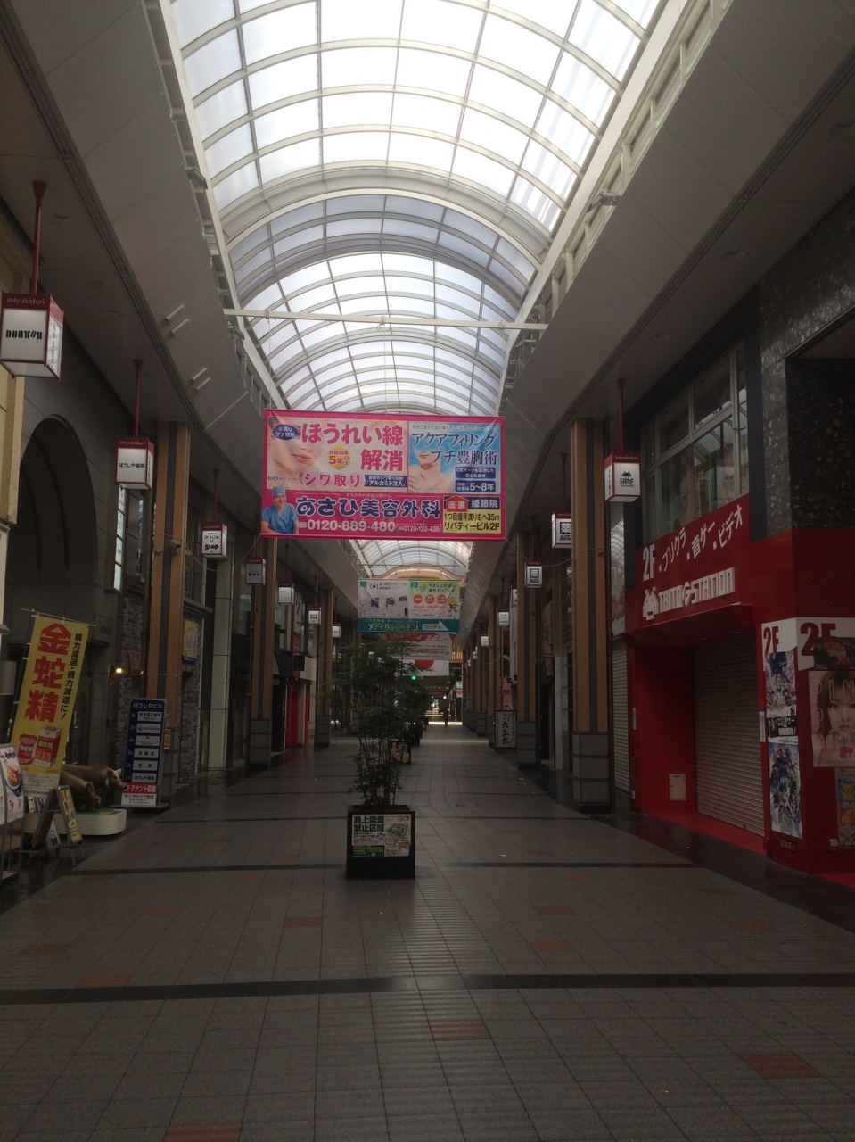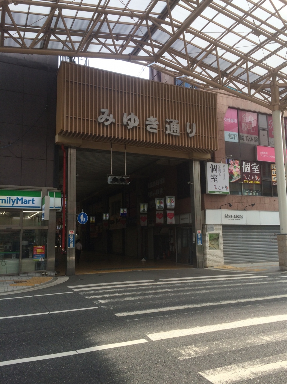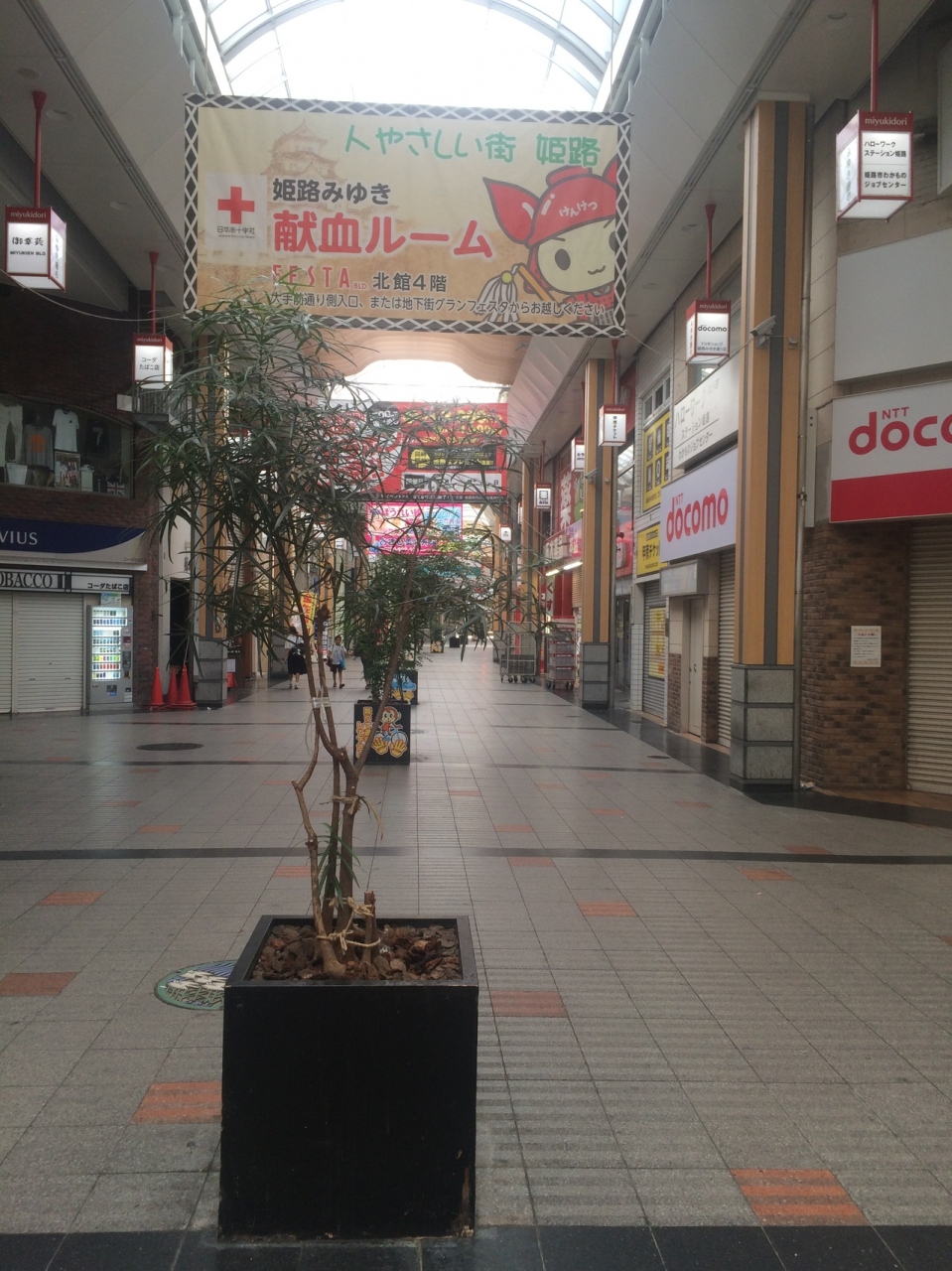 JR姫路駅前からの商店街で天井が高くアーケードになっていて雨が降っても濡れずに便利です。途中、通り沿いに道がいくつか交差していました。天井からの垂れ幕が目立っていました。駅前から直結しているだけあり、姫路1の賑わいでした。