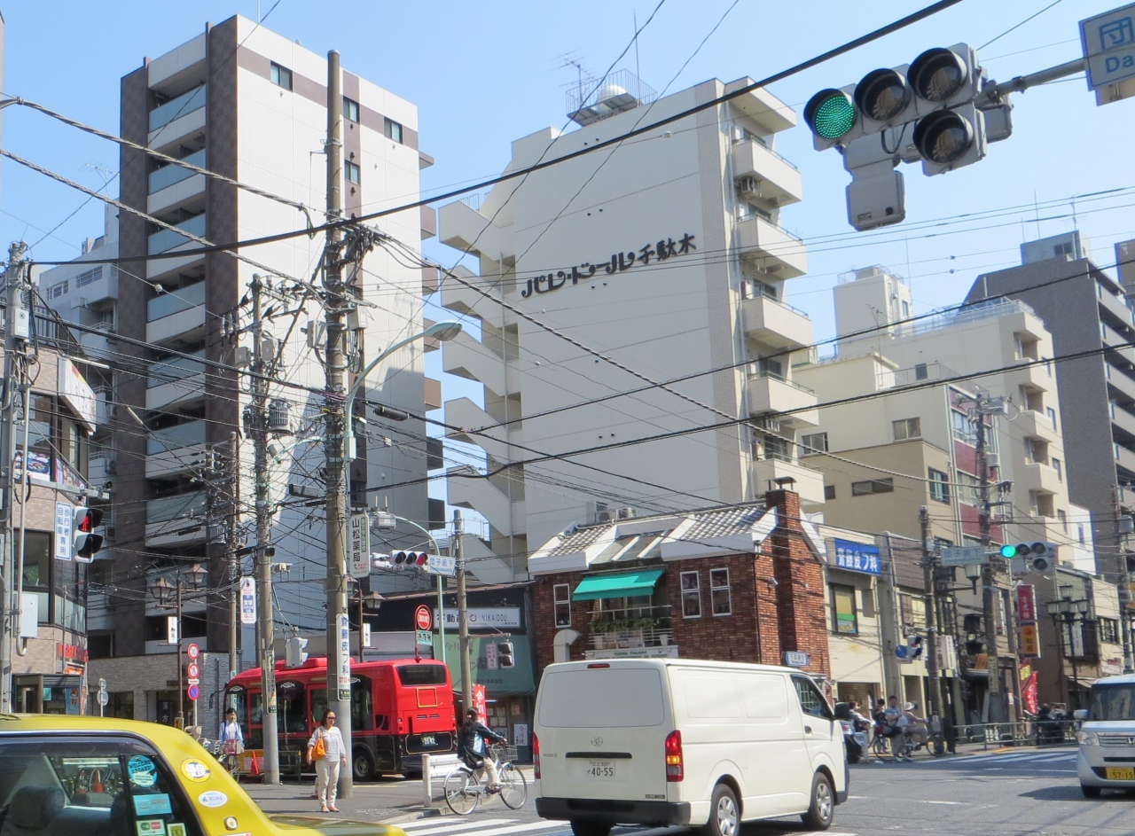 不忍通りを挟んで反対側は 台東区の谷中なので 台東区の区民バスめぐりんが走ってます。