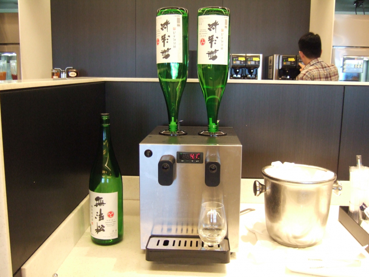 ラウンジはプレミアムチェックインから直結ですが、なぜか窓の下半分は曇りガラスになっていて、眺めは良くありません。JALのサクララウンジと違い、日本酒を置いています。