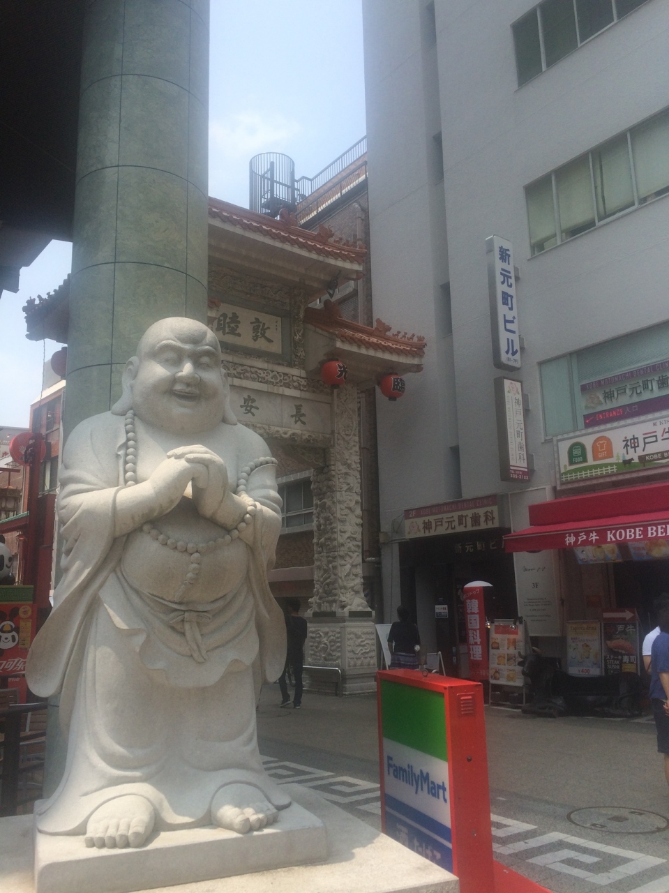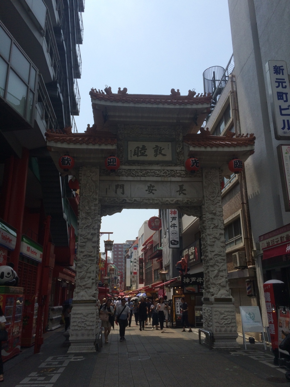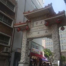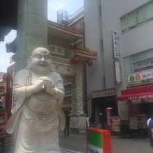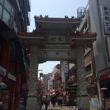 南京町の東の入口で元町駅からも近いので人が多い場所でした。白い門の左右の柱にはたくさんの龍と雲の彫刻は目を見張るものがありました。屋根は赤い色で三層になっていて赤い提灯がぶら下がっていました。布袋さん像が横にあり笑顔です迎えてくれるのも良いです。
