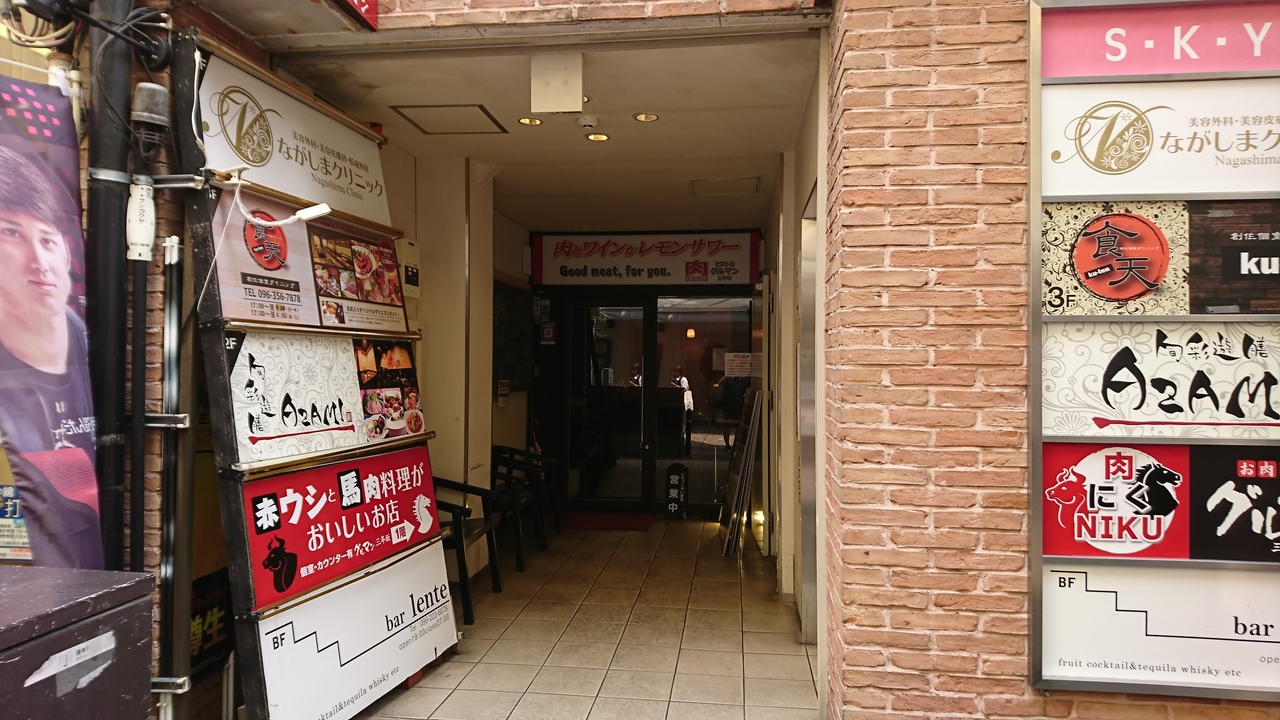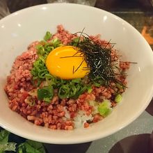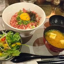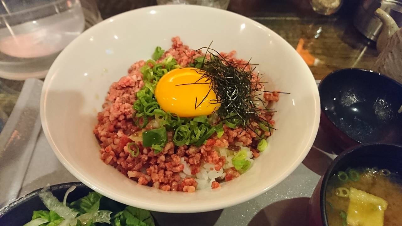 通町筋近くにあるお店。熊本県産の赤牛と馬肉にこだわるお店で、熊本の地ビールも飲める。ちょい飲みもできる感じ。カウンター席もあるので一人でもオーケー。ランチは、ステーキ丼などの丼もの中心。目を引いたのは「馬トロ丼」。ネギトロ丼の馬肉バージョンで、ご飯の上にはフレークされた馬肉がのっていて、玉子(きみ)に醤油をかけて混ぜて食べます。馬肉は牛肉よりも臭みがなく、あっさりしているので、そこを玉子がカバー。丼ものとしては完璧な味でした。