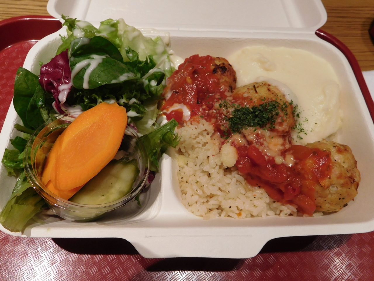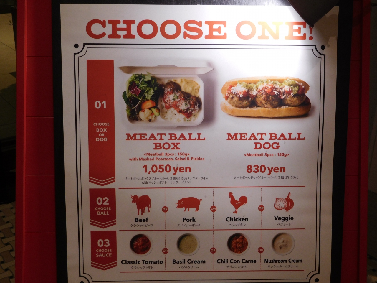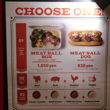 東京ミッドタウン日比谷の地下1階、HIBIYA FOOD HALLの奥の方にあるお店です。アメリカンスタイルのお店で、まず、野菜が入ったボックスか、パンに挟んだドッグかを選び、その後、ミートボールの種類とソースの味を選んで注文し、番号札の書かれたレシートを受け取って、番号が呼ばれたら取りに行くシステムになっていました。カジュアルな雰囲気でもあるので、さっと食事を済ませたい時には便利なお店だと思いました。