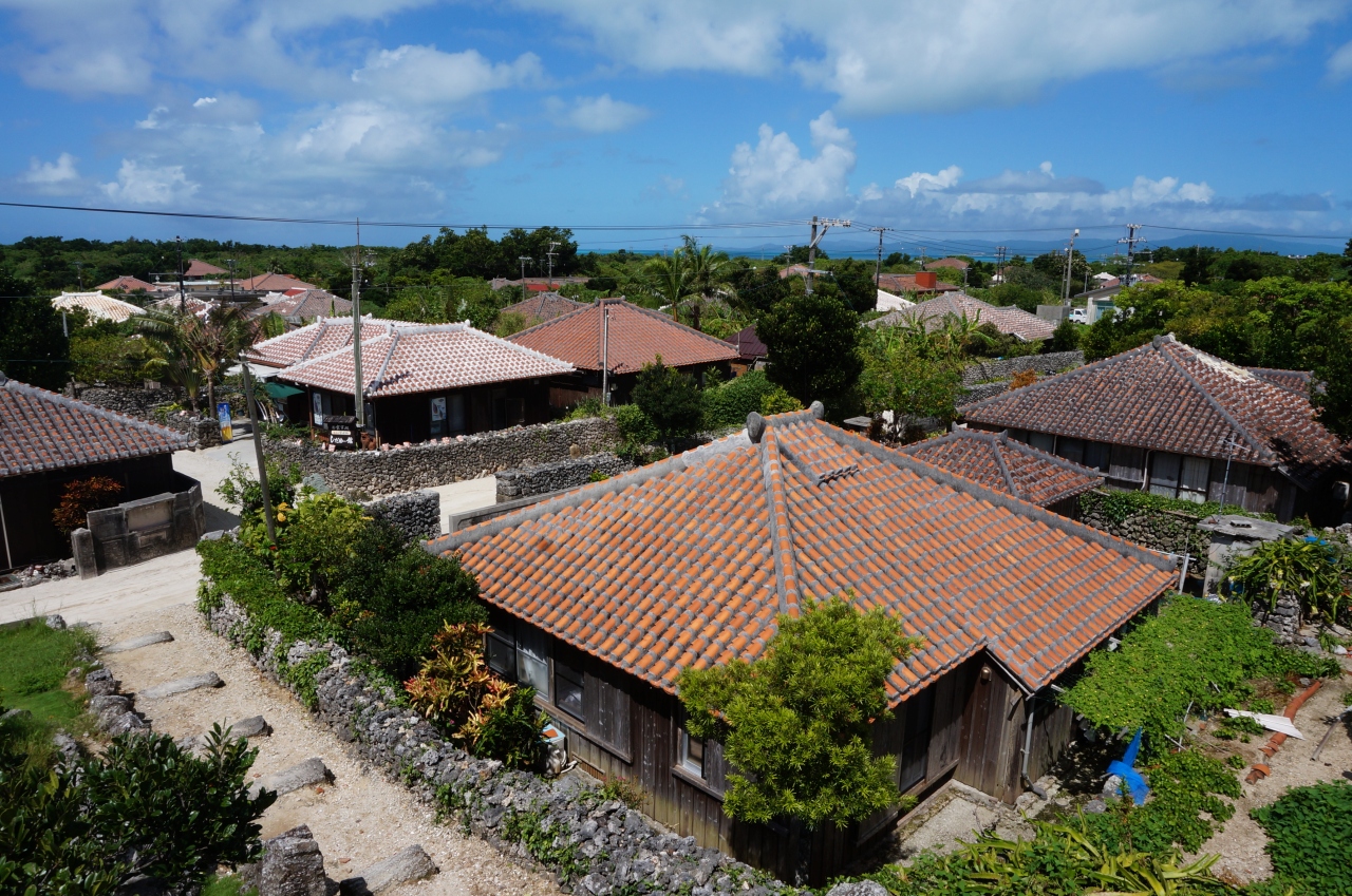 同じ日本だとは思えない、赤瓦の平屋の建物に白砂の道、南国の花々、とても美しい町並みです。