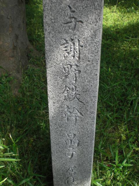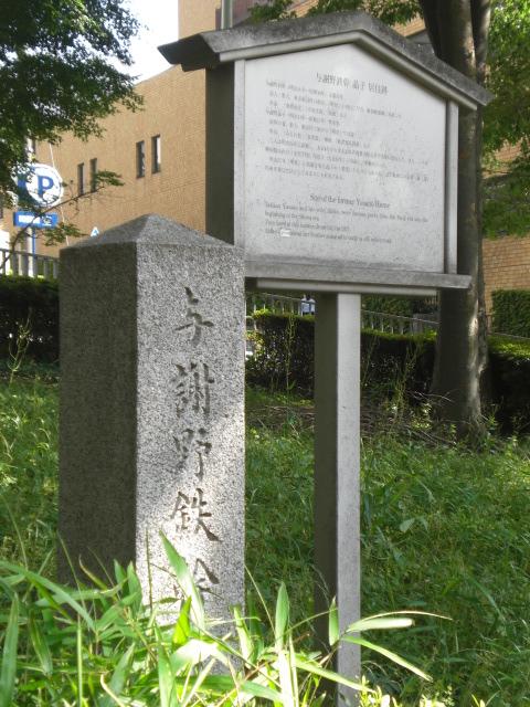 四角柱の石碑には、与謝野鉄幹晶子居住跡との表示があります。