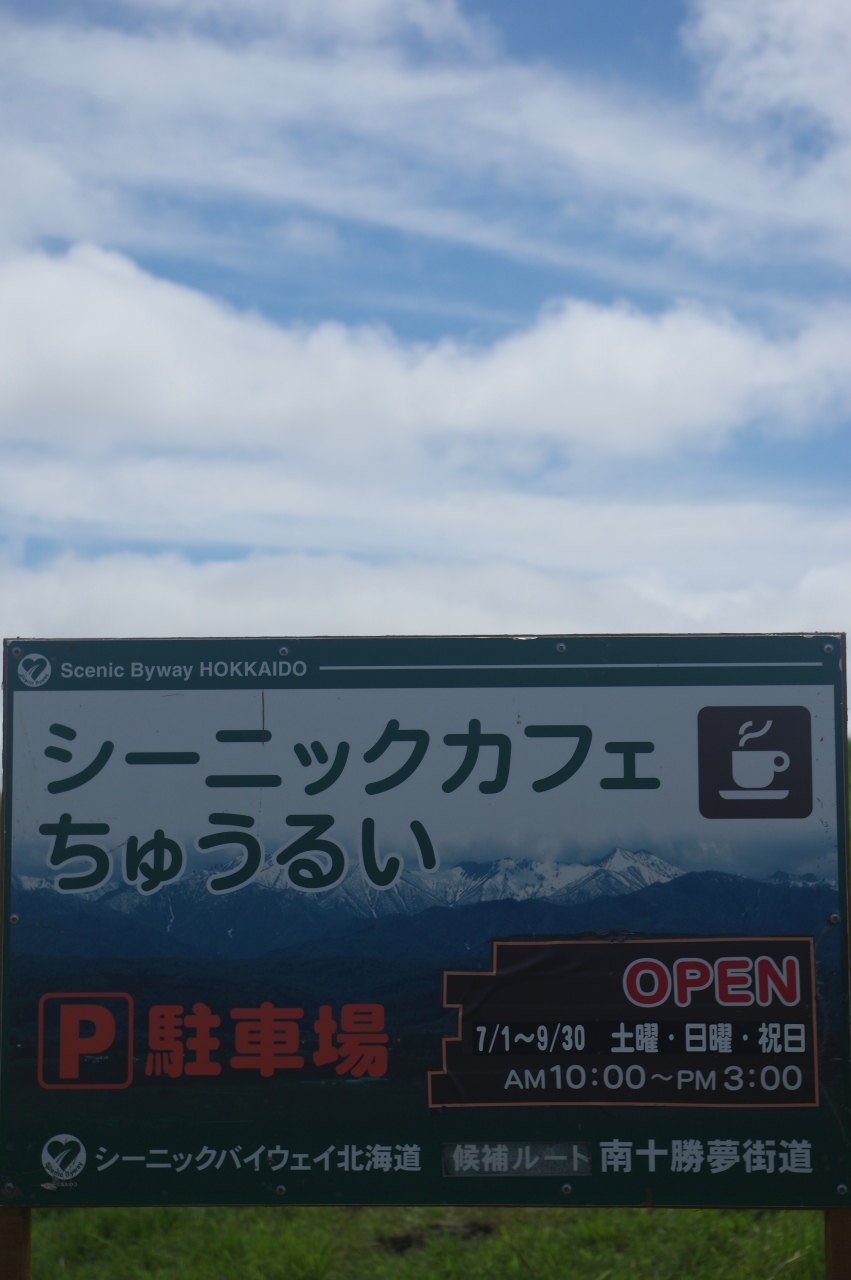 夏季のみの限定ですが牧場の一番高みに喫茶店が開きます。「シーニックカフェちゅうるい」で、無料でコーヒー他がいただけます。ボランティアの方々の接待です。4人掛けのテーブルがいくつもあり、丘からの風景を楽しみながらお茶できます。風景は眼下に忠類の市街を見下ろせるだけでなく、十勝連峰の南部の山々が目前です。風が吹き抜け本当に気持ちよく過ごせます。斜面に牛が草を食んでいる様子が見えます。