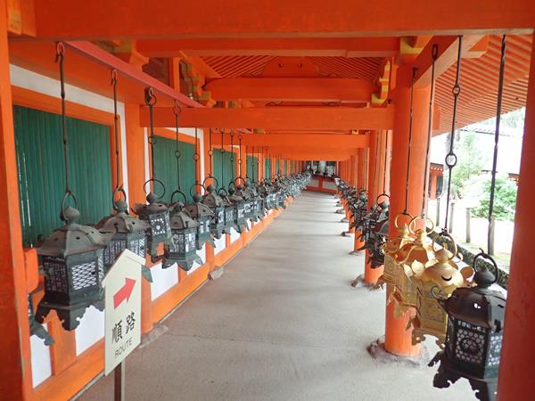 朱塗りの回廊に並ぶたくさんの釣燈籠の中を歩くことができます。