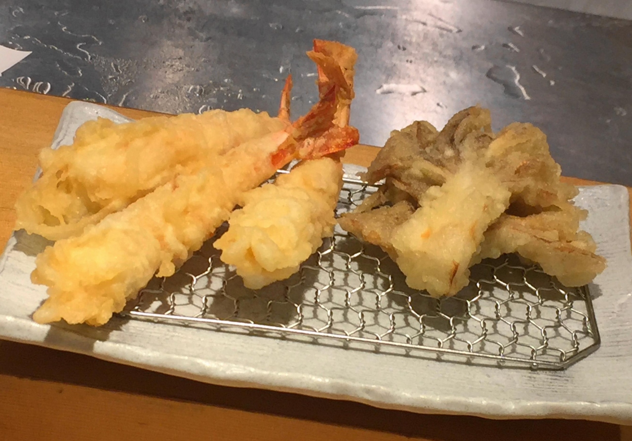 海老はプリプリ、キスはふんわり、マイタケとお茄子も美味しいです。