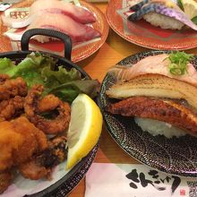 お盆のお昼時で、40分ほど待ちました。100円寿司にはない美味しさでした。炙り三種がとても美味しかった☆うなぎと穴子と炙りサーモンが乗っていて、税別385円でした。