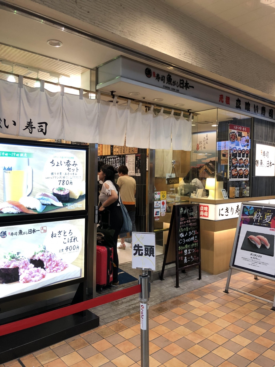 品川駅改札内にある立ち食い寿司のお店です。エキュートのサウス、飲食店が固まっているところにあり、京浜東北線や山手線のホームに近く、普段使いにも便利です。利用方法は様々。さくっと数貫だけっていうのも全然OKなので、気が向いた時にちょこっと寄ってます。お鮨は注文に応じて板前さんが握ってくれます。注文は一度に2種類づつ。値段表示は一貫ですが、提供は二貫です。なので一度の注文で四貫となるので、頼みすぎには要注意です。時間帯によって、列を成していますが、回転が早いので、それ程待つことなく入れます。